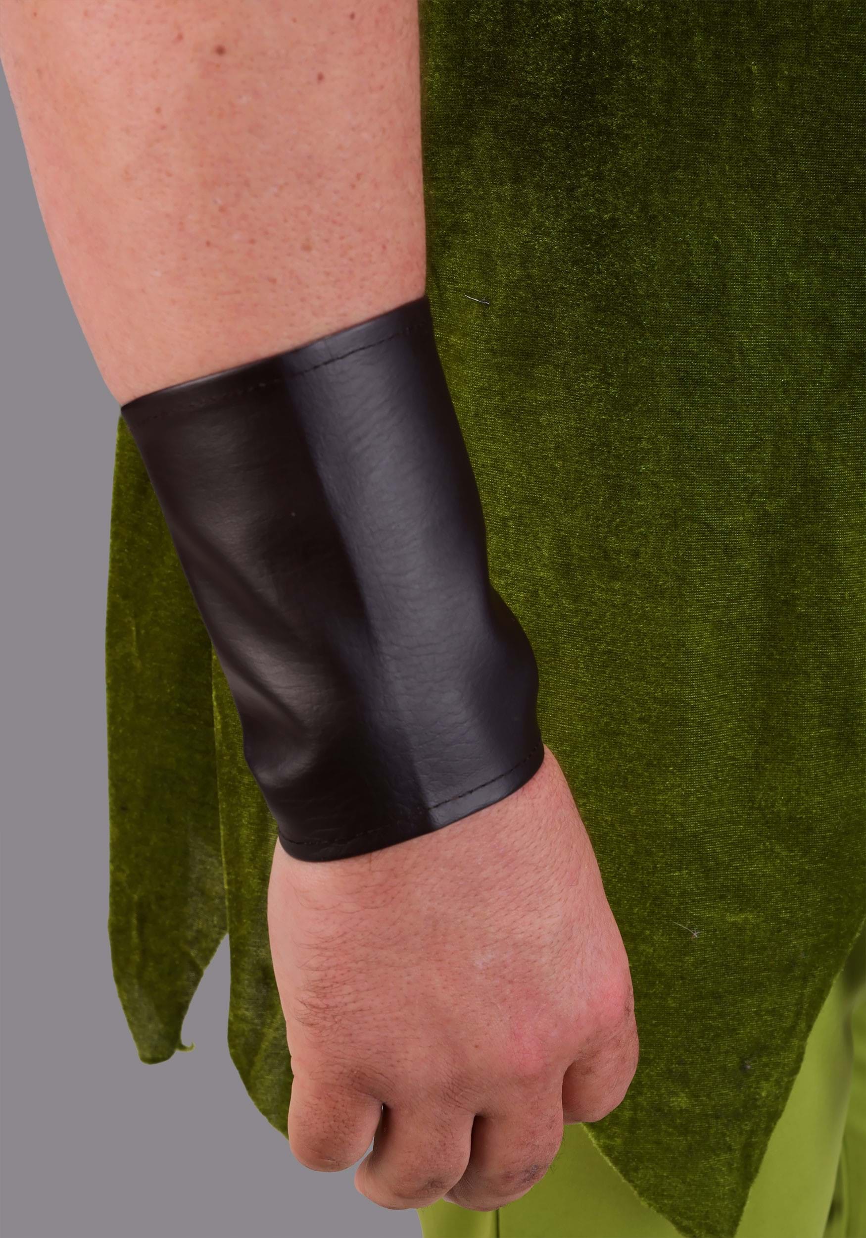 Begin with the green tunic that drops down to your mid-thigh with a faux-wrap design and tattered sleeves and hem. Cinch the look together with the belt that includes a knife harness (in case you come face to face with some pirates who demand you come in early on Monday). The faux leather gauntlets fit around your forearms and the signature cap completes the look.