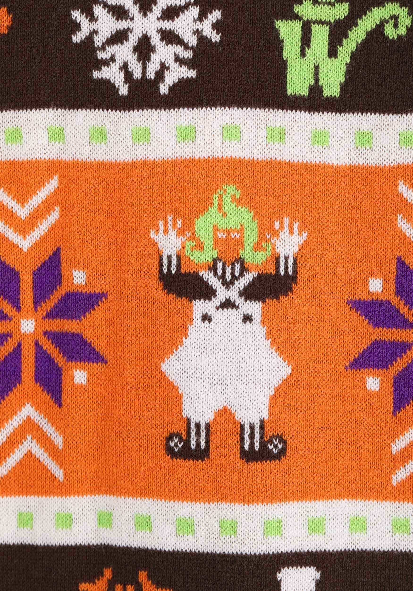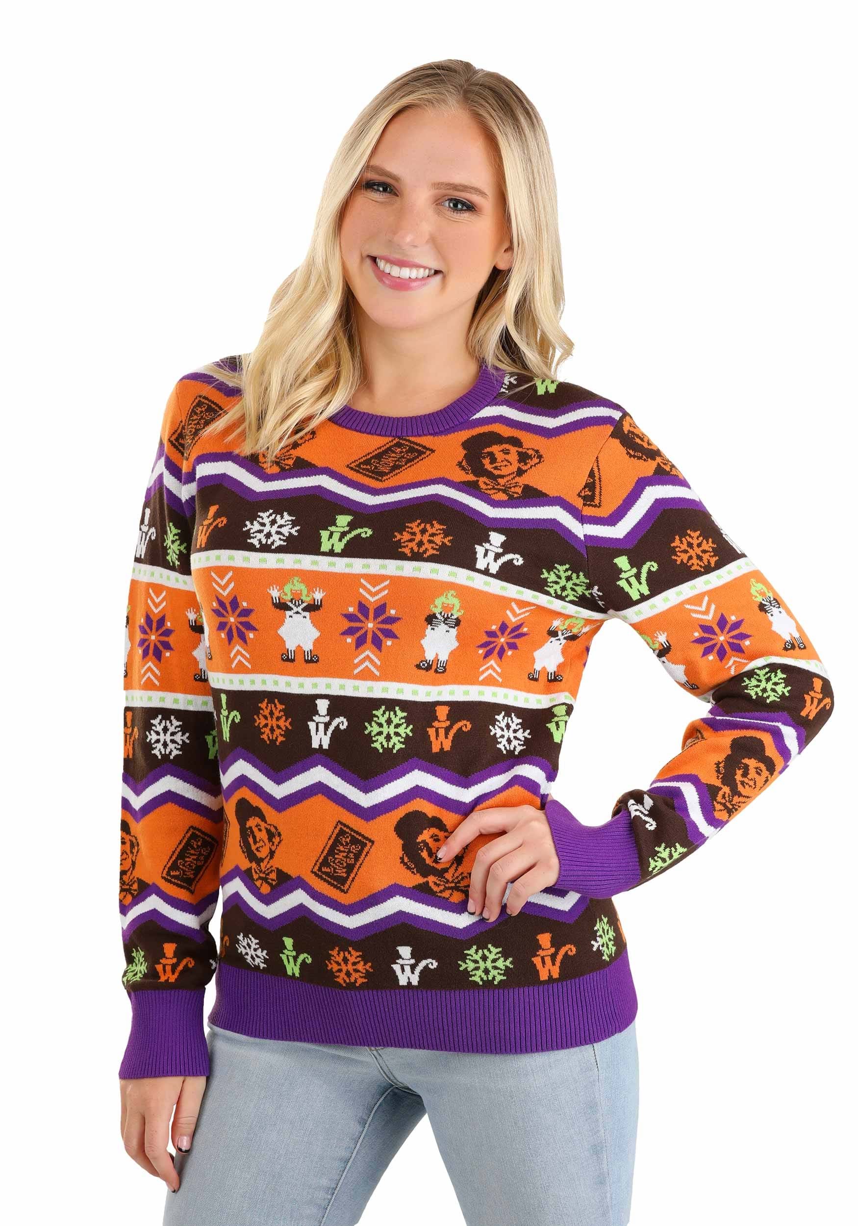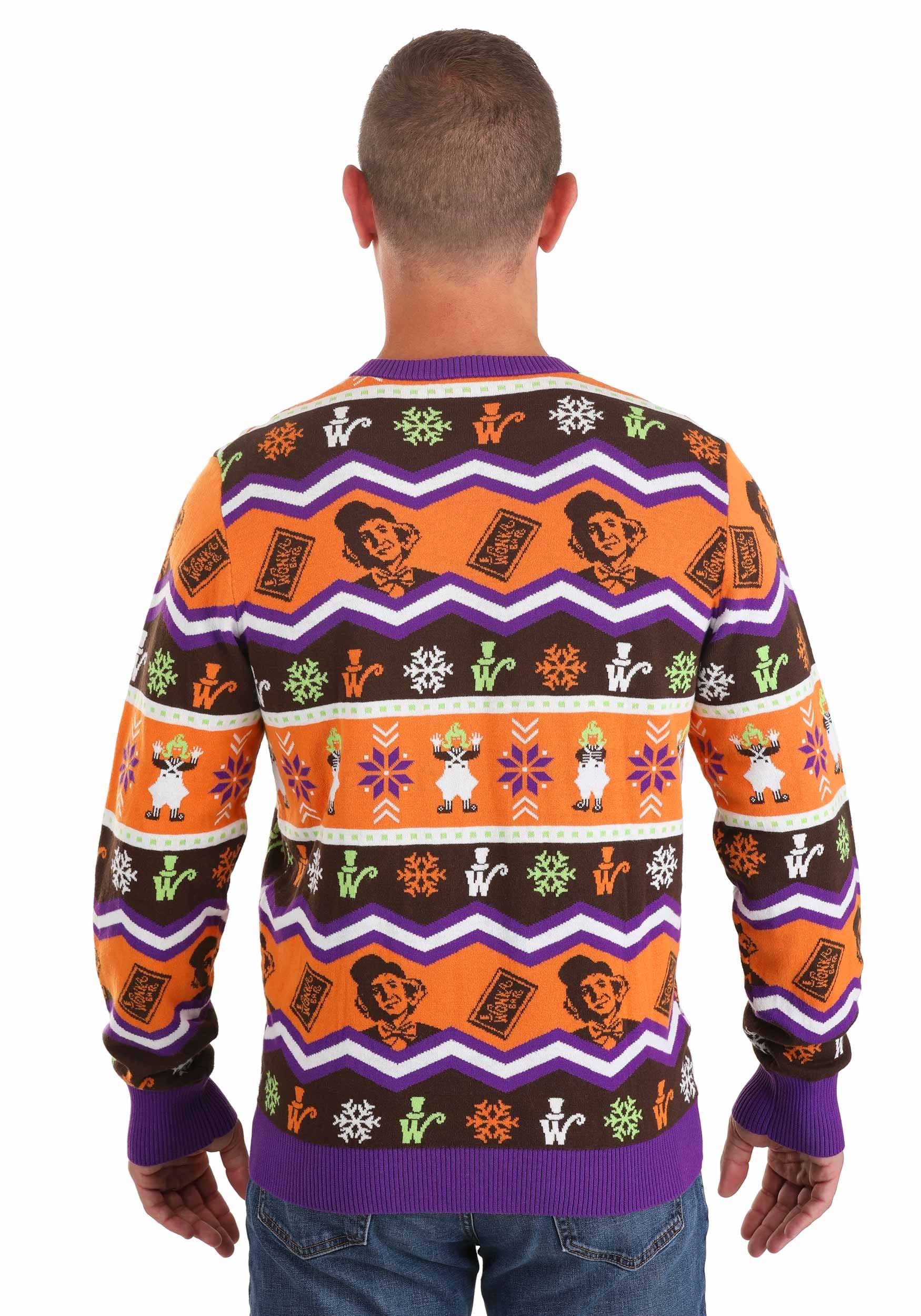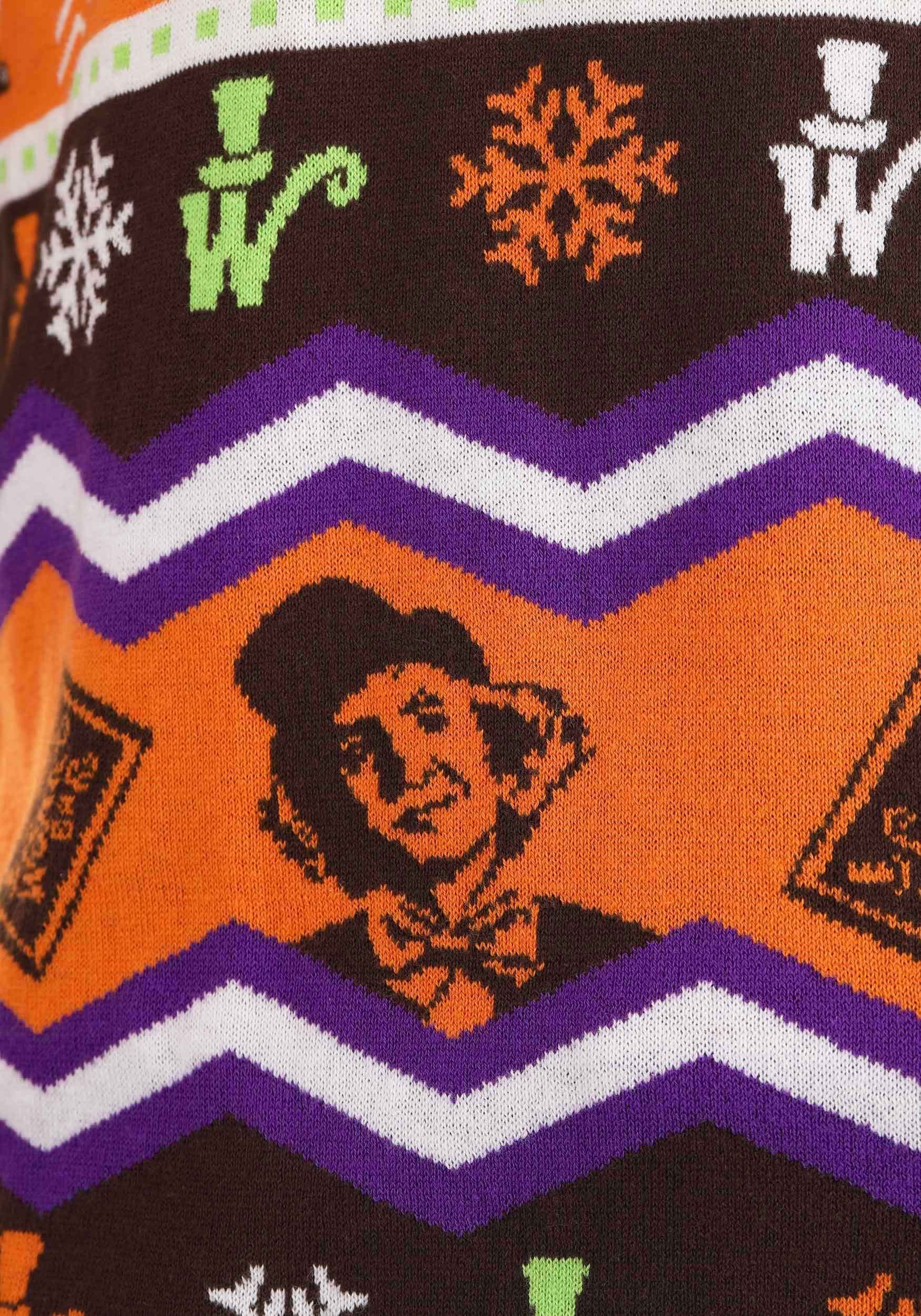 Our Willy Wonka sweater for men and women has ugly sweater styling that fans of the 1971 movie will love. The all-cotton knit sweater has a Wonka-esque color scheme that features orange, brown, purple, and green. It features a Fair Isle style design complete with the images of Oompa Loompas, snowflakes, Wonka bars, and even Willy Wonka himself! With a unisex fit, this sweet sweater is Warner Brothers officially licensed so you can proudly sport it at your next holiday party.