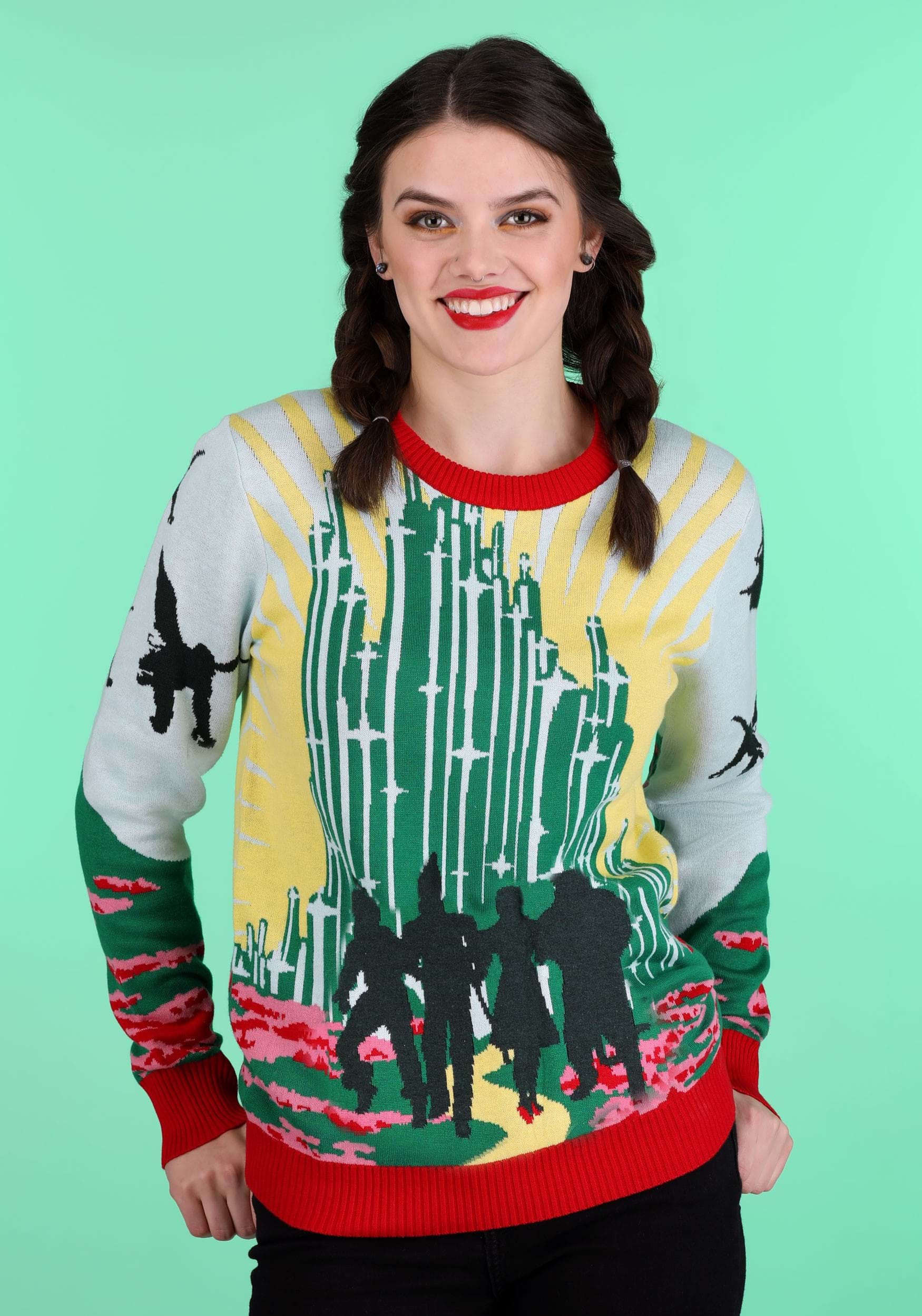 Designed by our in-house creative team, this officially-licensed Wizard of Oz sweater is sure to enchant any wardrobe. While the red and green design is a fun twist on the "ugly Christmas sweater" theme, the evergreen Emerald City has a place in your yearlong wardrobe. Purchase this exclusive look for the Wizard of Oz enthusiast on your Christmas list or buy it for yourself. Eitherway, you'll find that this sweater puts that special Oz skip in your step!