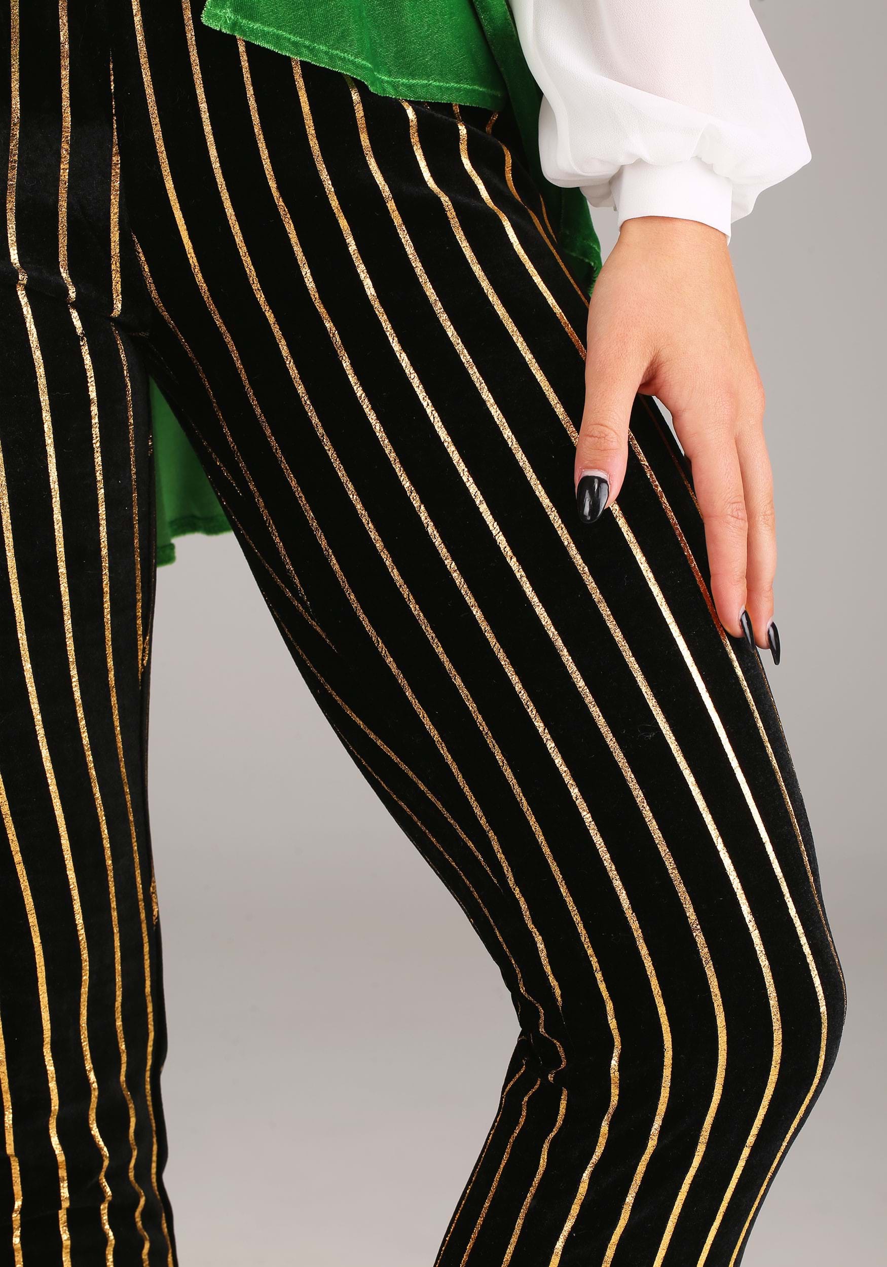 - Pants have vertical metallic gold printed pinstripes